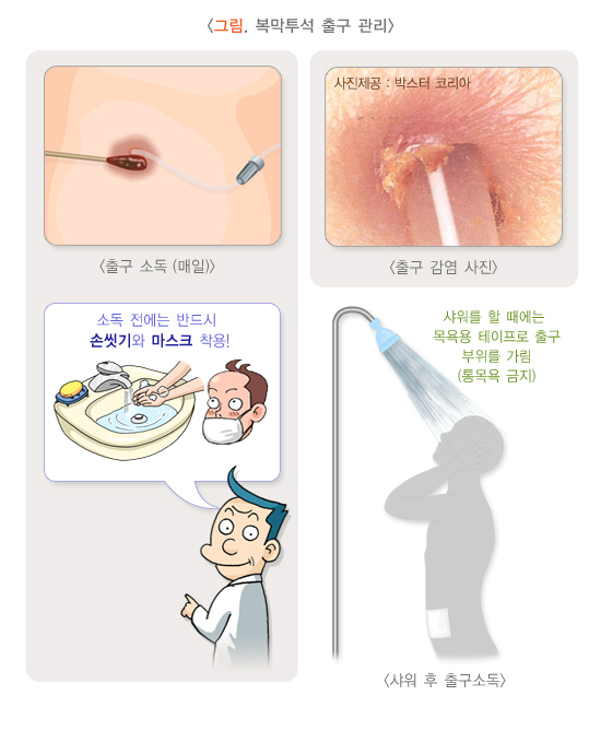 투석액 교환 전에 손을 씻고 마스크를 착용하여 입, 코, 손에 상주하는 균이 복강 안으로 들어가지 않도록 합니다. 투석액을 교환한 후에는 배액된 투석액의 양과 색깔을 확인하여 이상이 있으면 즉시 복막투석실에 연락해야 합니다.