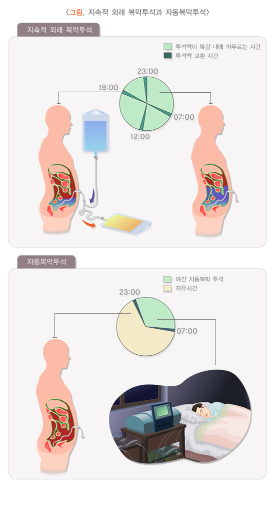 복막투석에는 손으로 하는 복막투석(CAPD)과 기계가 해주는 자동 복막투석(APD)이 있습니다. 일반적인 방법은 손으로 하는 복막투석으로 지속적 외래 복막투석이라고도 합니다. 투석액을 4-6시간 간격으로 하루 3-4회(아침, 점심과 저녁, 자기전) 직접 교환하는 방법입니다. 손으로 직접 하기 때문에 투석액 교환 전후로 무게를 재서 수첩에 기록해야 합니다. 반면에 자동 복막투석은 잠자는 동안(8-10시간 가량) 기계가 정해진 프로그램에 따라 자동으로 투석액을 교환합니다. 아침에 투석액을 주입하면 낮 동안에는 투석액을 교환하지 않은 채 일상생활을 하고 취침 전에 기계에 연결한 상태로 수면을 취합니다. 자동 복막투석은 최근 일부 기계가 투석액 부피를 자동으로 측정 및 저장하고, 이 데이터를 병원에서 원격 모니터할 수 있어 이전보다 편리해졌습니다. 특히, 바쁜 일정을 갖고 있는 직장인이나 학생에게 유리해서 낮 시간의 직장, 학교 생활 및 사회활동의 제약이 적습니다. 복막투석은 복막염을 예방하기 위해 청결한 자기관리가 중요합니다. 수영이나 통목욕은 할 수 없으므로 평소 생활습관을 고려하여 결정합니다.