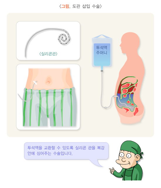 복막염이 발생하면 발열, 구토, 복통과 함께 투석액이 탁해집니다. 이때는 즉시 복막투석실에 연락하여 적절한 진단 및 치료를 받아야 합니다. 복막염은 대부분 완치되므로 너무 걱정할 필요는 없지만, 진단과 치료가 지연되면 회복되기 어려운 손상을 입을 수도 있습니다. 반복되는 복막염과 기타 원인으로 인하여 복막상태가 투석치료를 지속하기에 어려운 경우에는 복막투석도관을 제거해야 합니다.