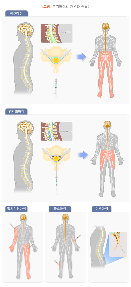 부위마취에는 척추마취, 경막외마취, 미추마취, 말초신경마취가 있습니다. 미추마취는 주사 부위가 다르기는 하나 경막외마취의 일종입니다. 수술 종류와 환자의 상태에 따라 필요한 신체 부위를 마취하기 위해 적절한 부위마취방법을 선택하고 시행합니다. 일반적으로 환자의 입장에서는 수술대 위에서 수술과 마취를 위해 적절한 체위를 취하고, 가는 바늘에 찔리는 느낌이 있다는 것 외에는 마취 방법을 구별하기 어렵습니다.