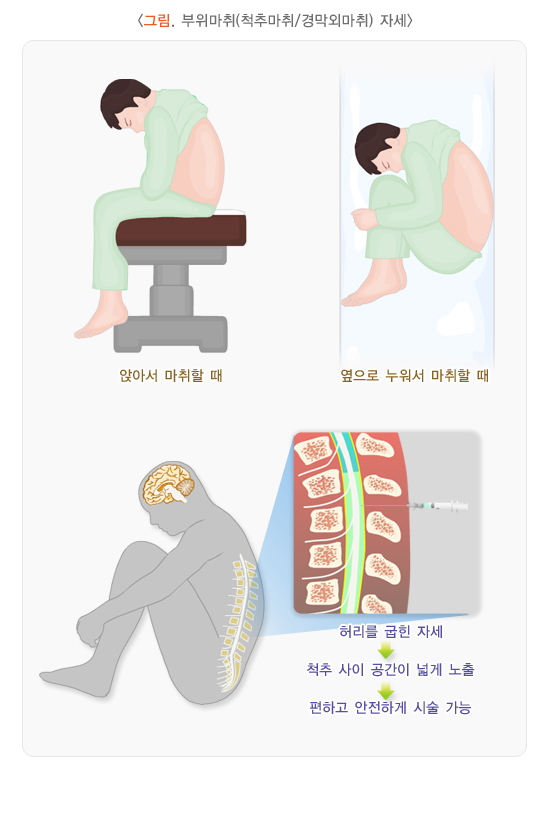 수술실에 도착하면 환자는 의사의 지시에 따라 적절한 체위를 취해야 합니다. 척추마취나 경막외마취는 수술의 종류와 부위, 환자의 체형 등에 따라 왼쪽 혹은 오른쪽으로 눕거나 앉아서 앞쪽으로 고개를 숙인 상태에서 시행됩니다. 특히 옆으로 눕게 되는 경우에는 허리를 새우등 모양으로 최대한 구부려주어야 합니다. 이러한 자세를 취하면 바늘이 들어갈 척추 사이의 공간이 넓어져 부위마취가 수월합니다. 미추마취는 엎드린 자세에서 시행할 때가 많습니다.