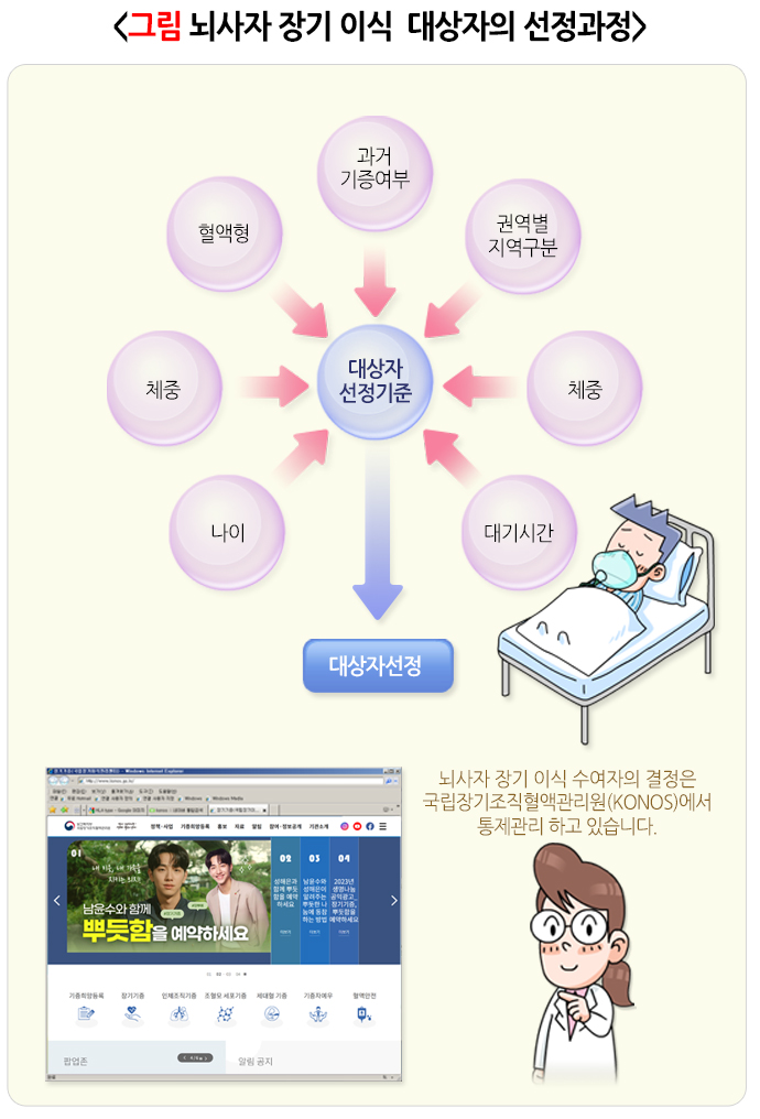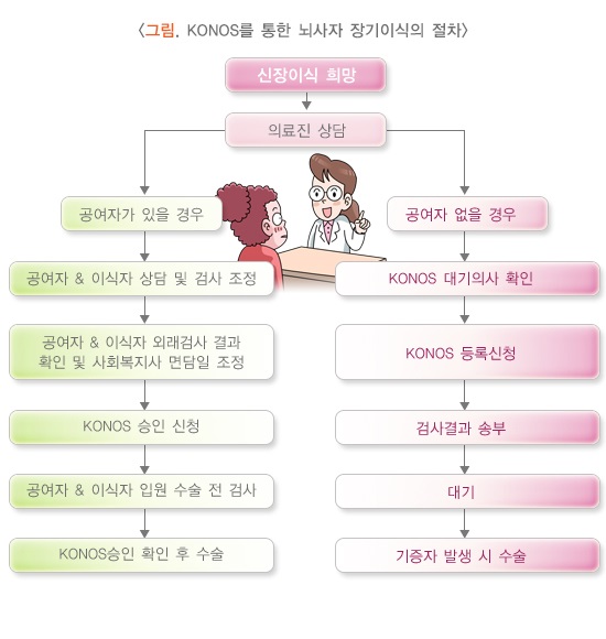 뇌사 장기 이식 수혜자의 결정은 여러 사항을 점수로 반영하여 국립장기조직혈액관리원(KONOS)라는 국가 기관에서 모든 상황을 통제 관리하고 있습니다. 2019년 국립장기조직혈액관리원 연보에 의하면 국내에서 뇌사 이식을 대기하는 말기 신부전 환자의 평균 대기 기간은 6년 정도입니다. 뇌사 이식을 대기하는 국내 말기 신부전 환자 수가 2만 명 이상인데 비해 연간 뇌사 신장 이식을 받는 환자는 1,000명이 채 안 되는 상태로 기증자가 매우 부족한 상태입니다. 따라서 뇌사 신장 이식은 말기 신부전으로 생명을 위협 받는 많은 환자들을 생존을 가능하게 하며 삶의 질을 향상시킬 수 있는 숭고한 일이라 할 수 있습니다.