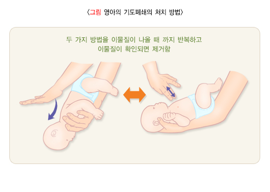 1세 미만의 영아의 기도폐쇄 시에는 ‘복부밀어내기 방법’을 사용하지 않으며, 다음과 같이 ‘가슴밀어내기 방법’을 시행합니다.
