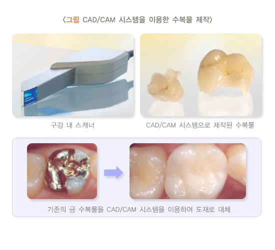 캐드/캠(CAD/CAM) 시스템은 기존의 치과용 인상재료를 이용하여 인상채득 후 기공소로 보내는 통상적인 과정이 아닌, 카메라를 사용하여 치아의 인상을 채득하는 것입니다. 디지털 카메라를 통해 채득된 치아의 인상 정보를 이용하여 수복물을 디자인하며, 기공소나 치과에서 직접 디자인한 수복물의 정보를 가지고 밀링머신(milling machine)으로 수복물을 제작하는 방식입니다. 초기에는 컴퓨터 그래픽과 디지털 기술의 한계로 기존의 인상을 채득하는 방식에 비해 정교함이 많이 떨어졌으나, 기술이 발전함에 따라 캐드/캠(CAD/CAM) 시스템을 이용한 치아색 인레이의 정교함이 높아지고 있습니다.