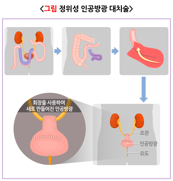 수술 후 소변은 새로 만든 방광 안에 저장되며, 장의 특성상 흡수가 일어나 소변 중 요소가 혈액으로 재흡수됩니다. 따라서 수술 전 적절한 신장 기능이 확인되어야 정위성 인공방광 대치술이 가능합니다.