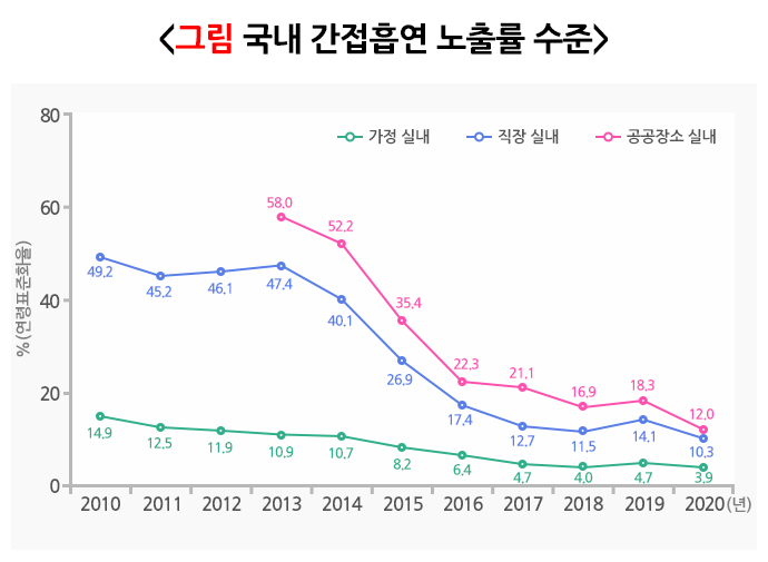 2020년 질병관리청에서 발표한 국민건강통계에 따르면, 만 19세 이상의 비흡연자들이 간접흡연에 노출되는 비율이 지속적으로 감소하는 추세를 보이고 있습니다. 2010년에 비해 가정 내의 간접흡연 노출률이 11.0% 감소하였고, 직장 내와 실내 공공장소의 간접흡연 노출률은 각각 38.9%와 46.0% 감소한 것으로 나타났습니다. 특히, 2012년부터 공공장소에서 금연구역이 확대되면서 직장과 실내 공공장소에서의 간접흡연 노출률이 더욱 뚜렷하게 감소된 것으로 생각됩니다.