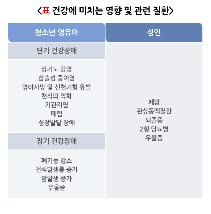 간접흡연은 직접 흡연했을 때와 같은 건강장애를 일으킵니다. 어린이와 성인에서 장‧단기적으로 발생할 수 있는 건강장애는 다음과 같은 것들이 있습니다.