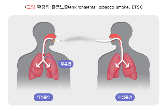 간접흡연은 환경적 흡연노출(environmental tobacco smoke, ETS)이나 이차흡연, 또는 비자발적 흡연이라고도 부릅니다. 담배 제품(궐련, 연초, 파이프 담배 등)이 탈 때 나는 연기와 흡연자가 연기를 내뿜을 때 나오는 연기를 비흡연자가 원하지 않게 들이 마시게 되는 것을 지칭합니다. 즉, 흡연자가 흡인한 뒤 내뿜는 연기인 주류연(mainstream smoke)과 담배가 타면서 담배 끝에서 나오는 부류연(sidestream)을 비흡연자가 마시게 되는 것입니다. 간접흡연 시 노출되는 연기는 부류연이 80%, 주류연이 20% 정도 되는 것으로 알려져 있습니다.