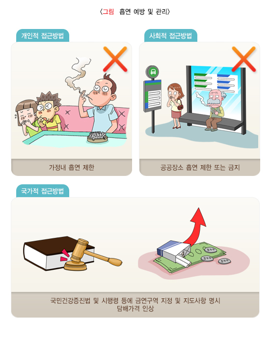 이러한 성과에 따라, 정부에서는 2019년 5월 「흡연을 조장하는 환경 근절을 위한 금연종합대책」을 발표하여 담배로부터 안전한 대한민국을 만들기 위해 노력하고 있습니다. 이 금연종합대책에는 흡연을 줄이기 위하여 담배광고‧판촉행위의 제한을 강화하고, 담배 같은 니코틴 함유 제품과 흡연 전용 기구에 대한 규제를 강화하는 내용이 포함되어 있습니다. 간접흡연을 줄이기 위한 대책으로는 국민건강보호를 위해 모든 공중이용시설에서 실내 흡연을 단계적으로 금지하기로 하였습니다. 2021년에는 연면적 500 ㎡ 이상의 건물에서 모든 실내흡연실을 폐쇄하고, 2023년에 모든 건물까지 확대하며, 2025년에는 모든 건물에서 실내흡연을 금지하여 직원과 비흡연자의 간접흡연 피해를 최소화할 계획입니다. 또한 거리에서의 간접흡연을 방지하기 위해 실외 흡연가능지역을 분리해 지정하기로 하였습니다. 이외에도 흡연예방교육과 금연치료를 강화하기 위해 흡연예방교육 프로그램을 개발하고 흡연자 맞춤형 금연지원서비스를 제공하고 있으며, 담배 규제 정책의 기반마련을 위한 연구개발도 지속적으로 시행하고 있습니다.