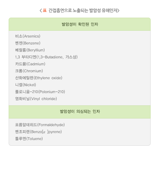 간접흡연으로 흡입된 담배 연기에는 암을 일으키는 69가지 이상의 유해한 성분이 들어있는 것으로 알려져 있는데, 대표적으로 다음과 같은 발암물질이 있습니다.