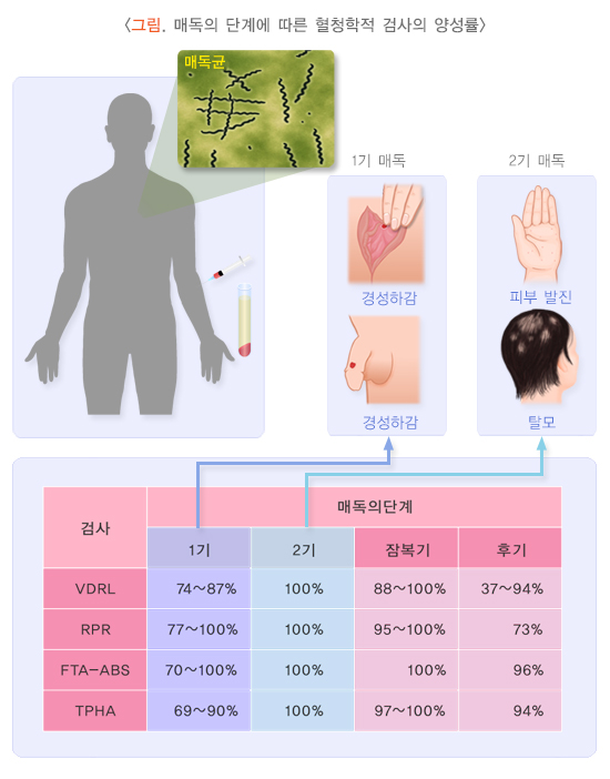 매독의 선별검사로 매독균에 의해 손상된 조직에서 흘러나온 지질단백성분과 매독균의 세포막 성분에 대한 항체를 검사합니다. 대표적으로 VDRL 검사와 RPR 검사가 있습니다. 매독의 진단뿐 아니라 치료 효과 판정에도 이용할 수 있습니다. 2기 매독 등 항체 농도가 너무 높은 경우에는 위음성이 나타날 수 있고, 다른 감염증(바이러스), 임신부, 일부 자가면역질환이 있는 환자에서 위양성을 보일 수 있습니다.