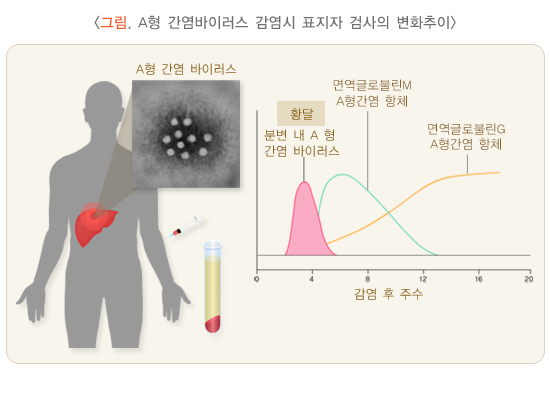 혈청에서 HAV IgM 항체를 확인하면 급성A형간염으로 진단할 수 있습니다. HAV IgM 항체는 급성기에 증가했다가 3~4개월 동안 혈액 내에 존재한 후 사라집니다. 감염 초기에는 음성으로 나올 수 있으므로, 임상적으로 의심되는 환자는 시간 간격을 두고 다시 검사합니다.