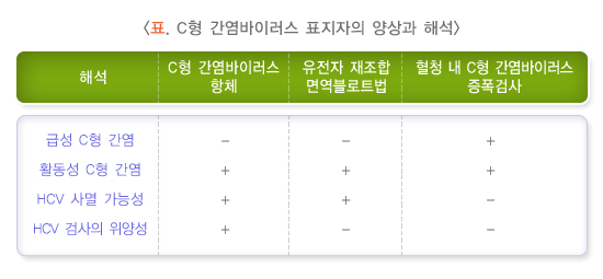 C형간염 항체 검사는 C형간염 바이러스 감염 고위험군에 대한 선별검사 및 C형간염 진단을 위한 일차적인 검사입니다. 일반적으로 효소면역분석법이나 화학발광면역분석법으로 선별검사를 하고 HCV 항체가 양성인 경우 유전자재조합 면역블로트법(recombinant immunoblot assay, RIBA)으로 확인합니다. HCV 항체는 감염 후 8~9주 이후 검출되며 회복되어도 지속적으로 검출되지만, 재감염 예방 효과는 없습니다. 혈액투석, HIV 중복감염, 심한 면역기능 저하, C형간염의 초기 경우에는 위음성률(실제 양성이지만 음성으로 판정되는 비율)이 높고, 자가면역질환을 가진 경우에는 위양성률(실제 음성이지만 양성으로 판정되는 비율)이 높아서 바이러스핵산검사(HCV RNA 검사)가 필요합니다.