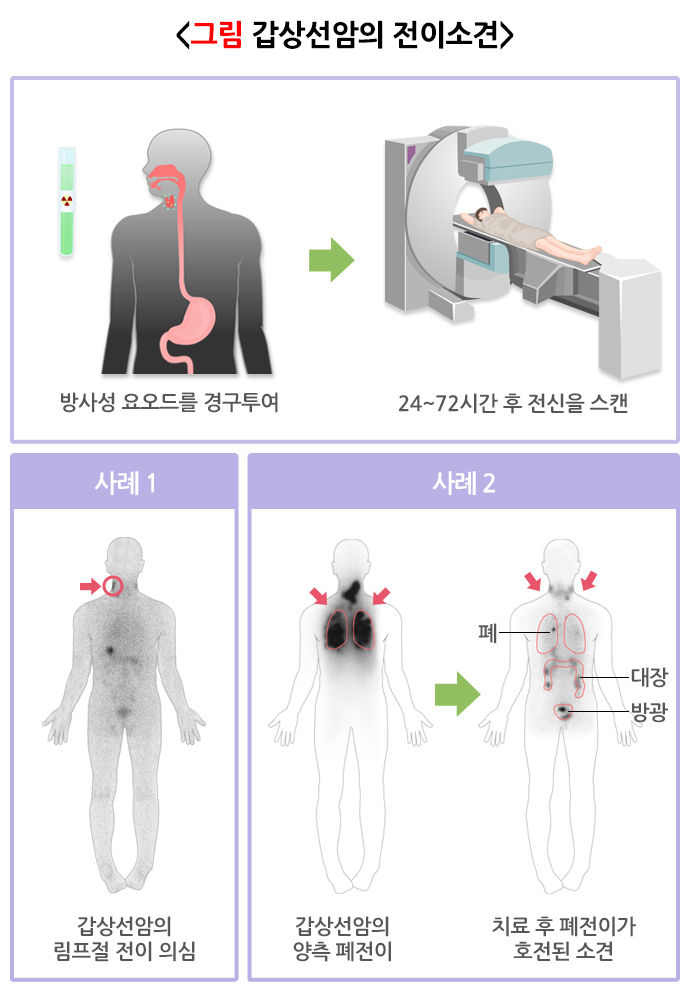 갑상선암은 주로 목주위의 림프절에 전이가 되고 폐나 뼈 등에 발생할 수도 있습니다. 방사성 요오드 전신스캔은 전이된 갑상선암을 방사성 요오드로 치료한 후 경과관찰할 때에도 유용합니다. 갑상선암 환자가 고용량 방사성 요오드 치료를 시행한 후에는 정상적인 방사능 섭취 부위 이외에는 전신에 이상 방사능 섭취가 보이지 않아야 합니다. 만약 이상 섭취소견이 보인다면 재발이나 전이가 의심되므로, 경우에 따라 확진을 위한 추가적인 검사가 필요합니다.