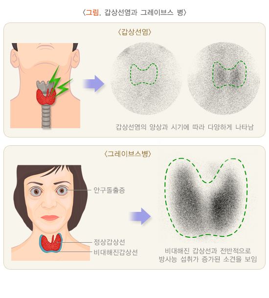 • 아급성 갑상선염(급성과 만성의 중간 정도의 갑상선염)이나 무통성 갑상선염(갑상선에 통증이 없는 갑상선염)의 급성기