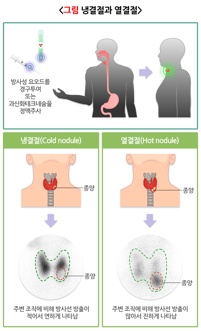 갑상선 결절은 결절 자체가 갑상선호르몬을 분비하는 기능이 있는지, 다발성인지 등에 따라서 치료방침이 달라질 수 있습니다. 갑상선스캔 영상 소견에 따라 결절은 냉, 온, 열결절로 나눌 수 있습니다. 영상으로 발견된 결절 중 냉결절의 19.8%, 온결절의 4%, 열결절의 2.1%에서 갑상선암이 발견되는 것으로 알려져 있습니다.