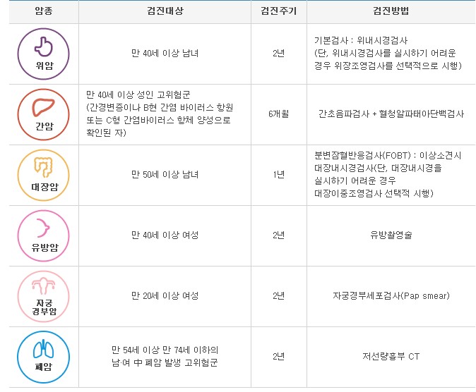 2) 우리나라는 1999년부터 저소득층을 대상으로 위암, 유방암, 자궁경부암에 대한 국가암검진사업을 시작하였고, 이후 2002년부터 대상을 전 국민으로 확대하였습니다. 2003년부터 간암 검진이 도입되고, 2004년에 대장암 검진이 추가되어, 국가 5대 암 검진(위암, 대장암, 간암, 유방암, 자궁경부암) 사업이 시행되어 왔습니다.