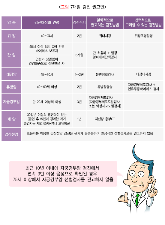 1) 우리나라 사람들에게서 흔히 발생하고, 검진을 고려할 만한 7대 암에 대한 권고안입니다.