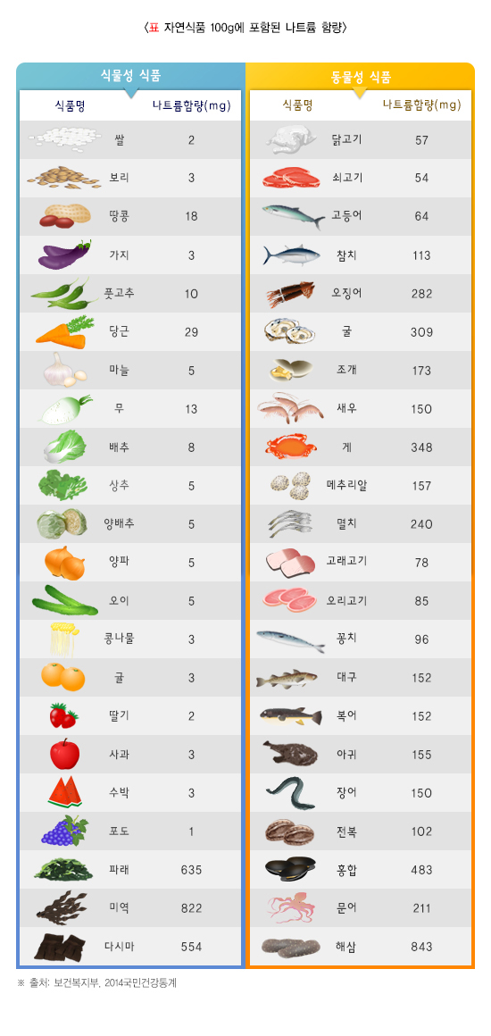 대부분의 자연식품에도 나트륨은 포함되어 있습니다. 나트륨은 식물보다 동물에서 생명유지를 위하여 더 큰 역할을 하기 때문에 일반적으로 동물성 식품에 포함된 나트륨의 양도 많습니다. 그리고 식물성 식품 중에서는 바다에서 나는 해조류들이 육지에서 생산되는 채소류에 비하여 나트륨의 함량이 많습니다. 이는 바닷물의 3% 가량이 소금으로 구성되어 있기 때문인 것입니다.
