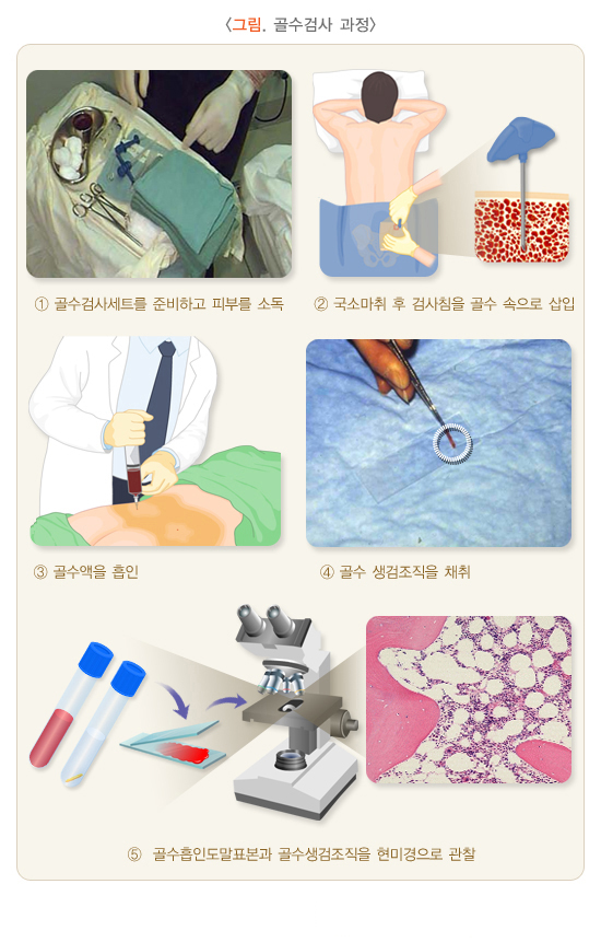 2) 아이오딘 등의 소독제로 검사 부위를 닦은 후 국소마취제를 주사합니다. 주사 부위에 감각이 없어지면 피부를 통해 뼈 속으로 검사침을 삽입해 골수액을 빨아들이고 골수를 얻습니다. 국소 마취가 되었어도 검사 중 밀거나 당기는 불편한 감각을 느낄 수 있습니다.