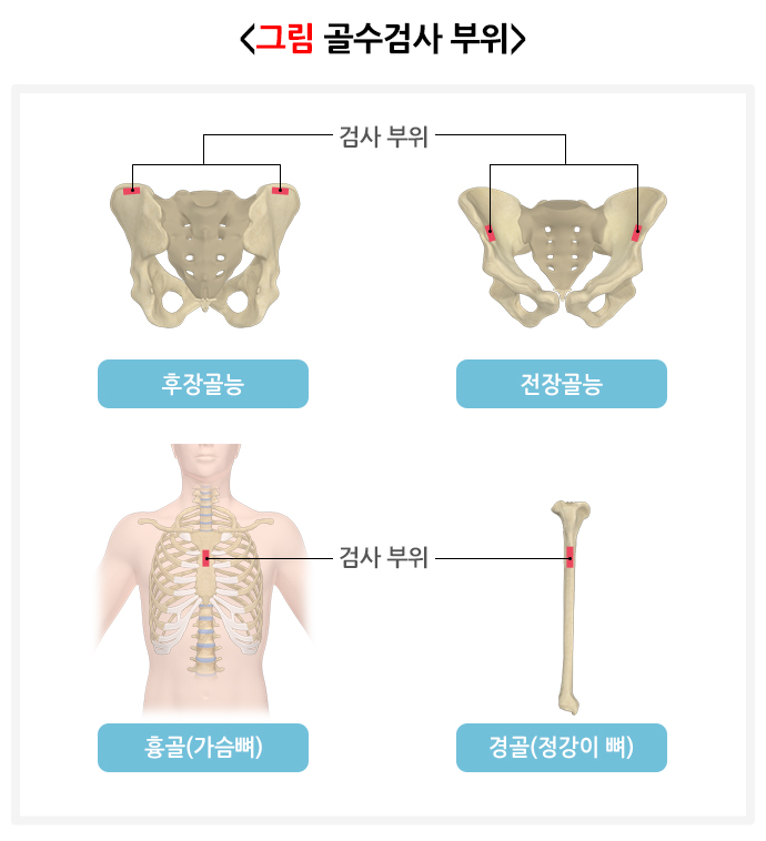 성인의 경우 일반적으로 골반 뒤쪽 후장골능 부위에서 시행합니다. 전신 방사선 치료를 받았거나, 외과적 수술 등의 이유로 엎드릴 수 없는 경우에는 엉덩뼈 앞쪽 전장골능 이나 가슴뼈에서 검체를 채취할 수도 있습니다. 영유아는 정강이 뼈에서 골수 흡인만 시행하기도 합니다. 골수의 변화는 짧은 시간 내에 전신적으로 일어나기 때문에, 어느 부위에서 검체를 채취해도 동일한 결과를 얻을 수 있으므로 한쪽만 검사하는 것이 일반적입니다. 하지만 림프종이나 비혈액암종이 골수에 퍼졌는지를 평가할 경우 양쪽 엉덩뼈에서 모두 검체를 채취하기도 합니다.