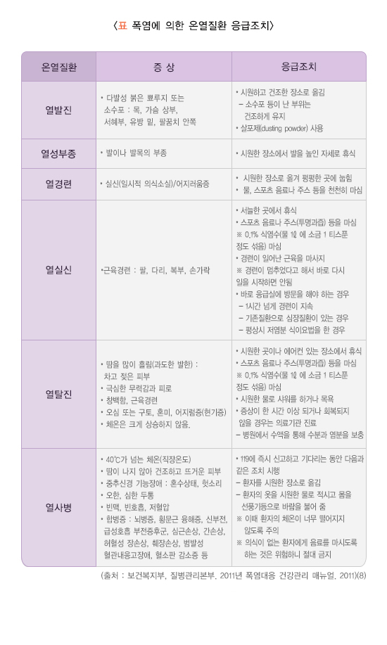 · 폭염 관련 건강 영향 및 응급처치 방법을 알고 있어야 합니다.
