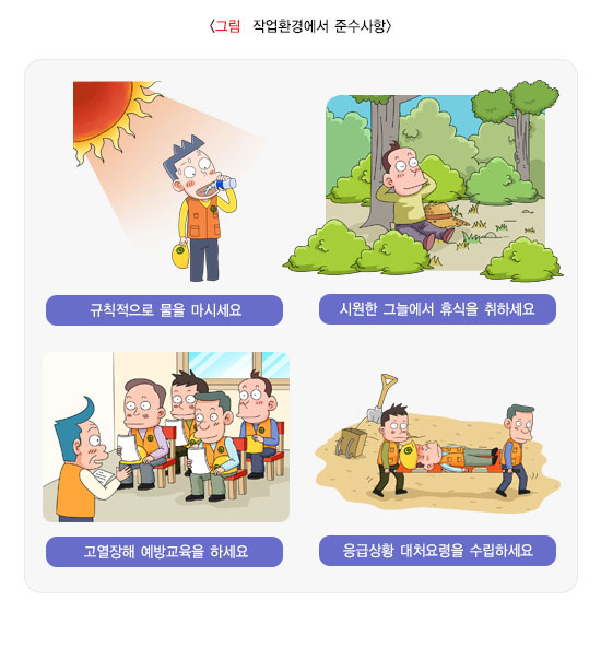 폭염에 노출되는 경우에는 가능한 한 직사광선을 차단할 수 있는 간단하고 쉬운 지붕이나 천막 등을 설치하며 활동 중에는 적당히 살수 등을 실시할 수 있도록 합니다.
