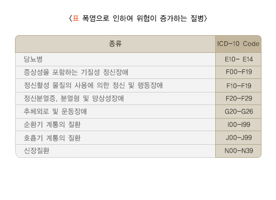 폭염은 심혈관계 질환에 직접적으로 영향을 주어 증상을 악화 시킬 뿐 아니라 병원 입원률 및 사망률을 증가시킨다고 알려져 있습니다. 폭염이 발생할 경우 전체 사망률이 증가하며, 사망자 대부분이 심혈관계 질환, 뇌혈관계 질환, 호흡기 질환과 같은 기존 질환을 가지고 있는 경우와 관련이 있습니다.