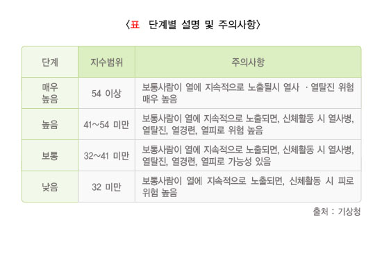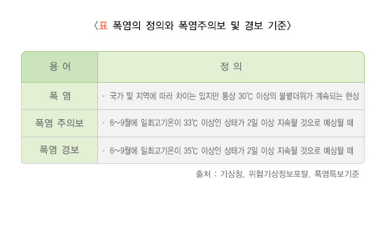 우리나라 기상청에서는 열파지수와 위험가능성의 정보를 76개 지역별로 4월 1일부터 10월 31일까지 제공하고 있으며, 이를 기반으로 폭염주의보, 폭염경보의 특보를 발령하고 있습니다. 폭염주의보는 6~9월에 일 최고기온이 33 ℃ 이상인 상태가 2일 이상 지속될 것으로 예상될 때 발령합니다. 폭염경보는 6~9월에 일 최고기온이 35 ℃ 이상인 상태가 2일 이상 지속될 것으로 예상될 때 발령합니다.