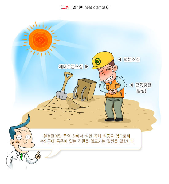 폭염 하에서 심한 육체 활동을 함으로써 수의근에 통증이 있는 경련을 일으키는 질환을 말합니다. 활동을 할 때에 자주 사용되는 사지나 복부의 근육에 동통을 수반하는 발작적인 경련을 일으킵니다. 땀을 많이 흘린 후 수분만을 보충하는 경우에 염분이 부족해서 발생하게 됩니다. 일반적으로 근육경련이 30초 정도 일어나지만 심할 때에는 2~3분 동안 지속되기도 합니다. 경련은 어느 근육에나 일어나지만 다리 및 복부 근육과 같이 활동을 할 때 가장 많이 사용하여 피로한 근육에 주로 일어납니다. 피부는 습하고 차가운 것이 특징이며 체온은 정상이거나 약간 상승합니다.