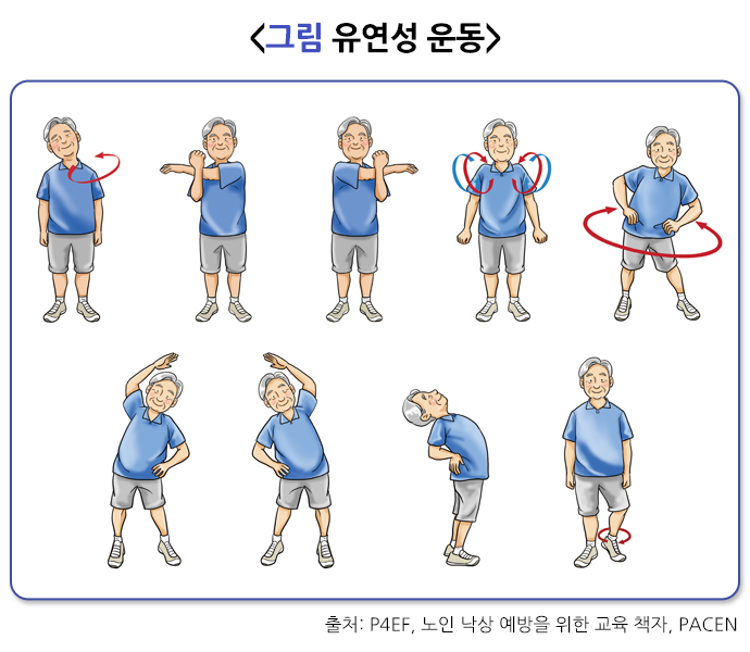 규칙적인 유연성 운동은 자세를 안정시키고 균형을 향상시키는 데 도움이 됩니다. 유산소 운동 및 근력 운동과 함께 병행하면, 노화로 인한 보행 능력 저하를 예방하는 데 더욱 효과적입니다. 주 2~3회 이상 각 부위를 대상으로 약간 불편함을 느낄 정도의 강도로 30초~60초간 유지하는 것이 권장됩니다. 어깨, 목, 몸통, 허리, 고관절, 다리, 발목 등 주요 관절 부위를 골고루 포함하여 시행합니다.