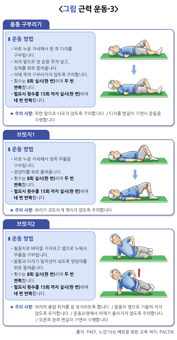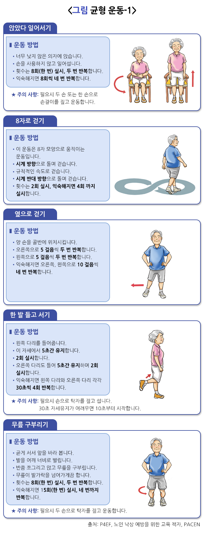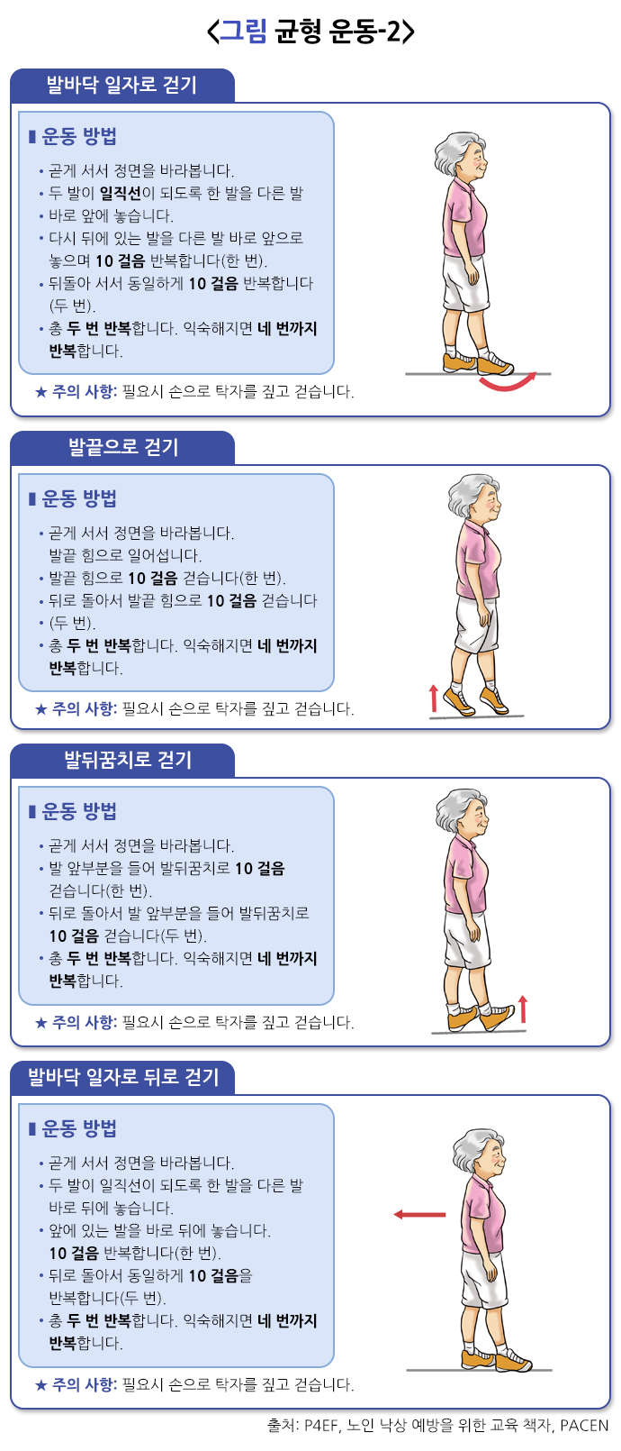 균형 운동은 낙상을 예방하고 일상생활에서의 이동 능력을 향상시키는 데 매우 중요하며, 주 3회 이상 하는 것이 권장됩니다. 균형 운동은 반드시 안전한 환경에서, 넘어질 위험 없이 도전적인 자세를 연습하는 것이 중요합니다. 예를 들어, 고정된 지지물을 잡고 한쪽 다리로 서기와 같은 동작을 통해 균형 감각을 향상시킬 수 있습니다. 한 가지 동작에 익숙해지면, 눈을 감거나 지지물 없이 시도해 보는 등 난이도를 점차 높여가며 더 어려운 단계로 진행하는 것이 좋습니다.