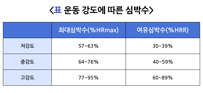 2) 여유심박수(Heart rate reserve, HRR) 방식: 안정 시 심박수와 최대심박수를 기준으로 운동 강도에 따른 목표심박수를 설정합니다.