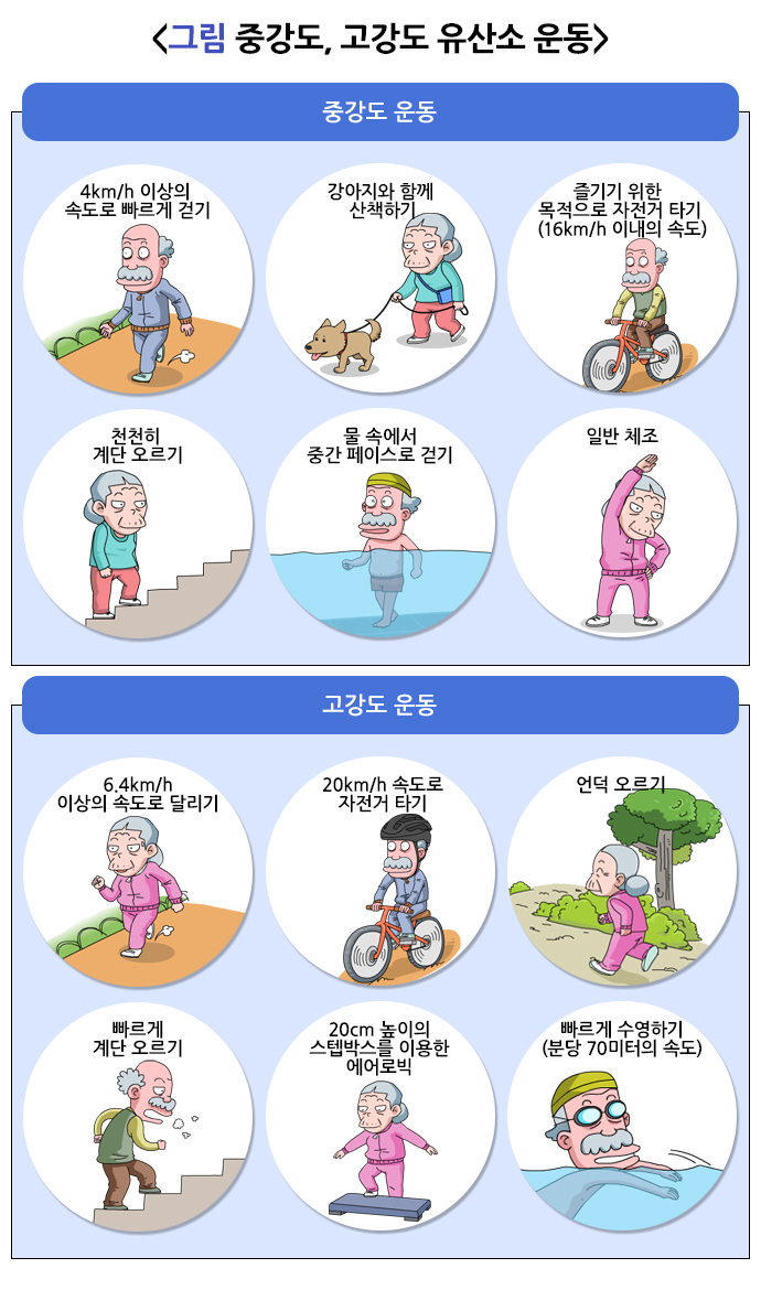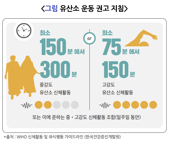 1) 중강도 유산소 운동: 일주일에 최소 150분 이상