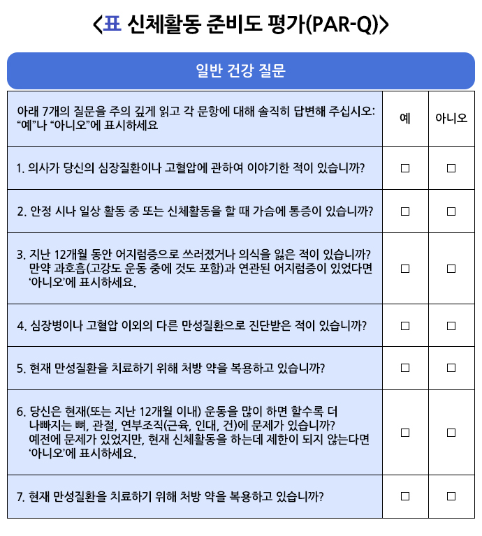 2. 신체활동 준비도 평가 (Physical Activity Readiness Questionnaire, PAR-Q)