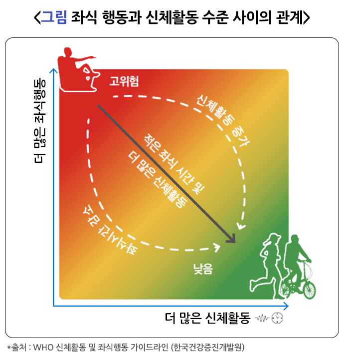 하루 종일 앉아 있거나 누워 있는 시간이 많을수록 심혈관 질환을 포함한 각종 만성 질환 및 사망 위험이 증가합니다. 이러한 좌식 행동 시간을 줄이고, 어떤 가벼운 움직임이라도 자주 실천하는 것이 건강에 큰 도움이 됩니다. 즉, 신체활동을 늘리는 것과 함께 좌식 행동을 줄이는 것이 건강을 지키는 중요한 요소입니다.