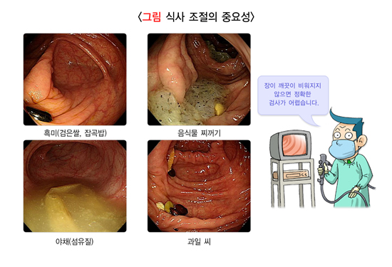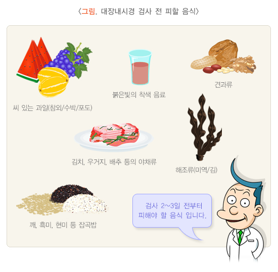 장정결제를 복용하기 전에 섭취한 음식물도 장정결 결과에 영향을 미칩니다. 음식 제한의 근거는 미약하지만 3일 전부터는 잡곡(흑미) 섞은 밥, 깨죽, 김, 미역, 옥수수, 견과류와 수박, 참외, 키위 등 씨가 있는 과일을 먹지 않는 것이 좋습니다. 흰쌀밥, 죽, 식빵, 카스테라, 계란, 두부, 감자, 커피, 녹차, 맑은 음료는 문제가 없고, 사과, 바나나 같은 과일도 먹을 수 있습니다.