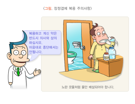 3. 매우 심한 복통, 배가 딱딱해져서 누르지 못하는 경우, 발열, 소주 한 잔 분량보다 많은 직장 출혈이 있으면 바로 병원을 찾아야 합니다.