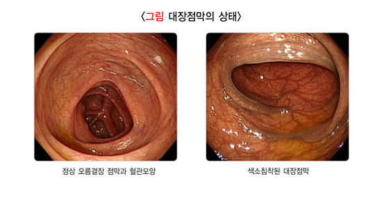 정상적인 대장 점막은 매우 얇고 투명합니다. 점막에 있는 혈관이 잘 보입니다. 생리적인 변화에 의해 장 점막이 흑갈색으로 변하는 경우도 있습니다. 변비 치료를 위해 복용하는 하제나 알로에 등을 복용하면 아래 우측 사진과 같이 대장 점막이 착색됩니다.