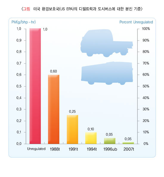 디젤엔진 배출물질 저감대책은 지난 수년간 주로 연소효율 향상과 같은 엔진 개선을 중심으로 이루어졌습니다. 기존의 직접분사 연료장치에 비해 고압의 연료 분사 시기와 분사량을 전자식으로 제어하여 엔진 소음과 배출가스의 양을 20-30% 저감할 수 있었고, 배기가스 재순환(Exhaust Gas Recirculation, EGR) 등의 디젤엔진 전자제어를 통하여 20-50%의 배출가스 저감에 성공하였습니다.