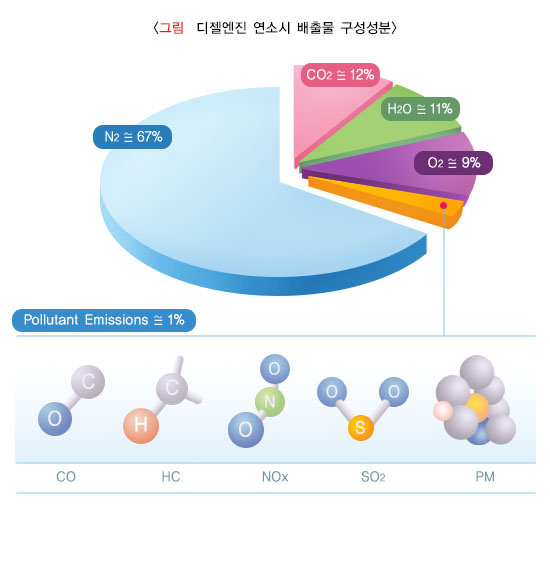 디젤연료는 탄화수소 혼합물로 이루어져 있기 때문에 완전 연소 시 이론적으로 연소 생성물은 이산화탄소(CO2)와 물(H2O), 엔진 흡입 공기(N2, O2 등)가 되어야 합니다. 그러나 실제로는 연료의 불완전 연소, 고온고압에서의 혼합물의 반응, 윤활유와 윤활유 첨가제의 연소, 그리고 연료첨가제와 연료 중에 들어있는 유황성분의 연소 등으로 미량일지라도 인체에 유해한 미세먼지(particulate matter, PM) 등의 디젤엔진 배출물질(pollutant emission)을 포함하고 있습니다. 이것은 가스 형태(gas phase)와 입자 형태(particle phase)로 구성되어 있습니다. 가스 형태로는 일산화탄소(caron monoxide), 질소산화물(nitrogen oxides)과 벤젠이나 포름알데하이드 같은 휘발성 유기물질들이 포함되어 있습니다. 입자 형태로는 유기탄소, 재, 황화물 및 금속 등이 포함되어 있습니다. 다핵 방향족 탄화수소(Polynuclear Aromatic Hydrocarbon, PAH)와 니트로아렌(nitroarenes)은 가스 및 입자 두 가지 형태 모두 포함되어 있습니다.