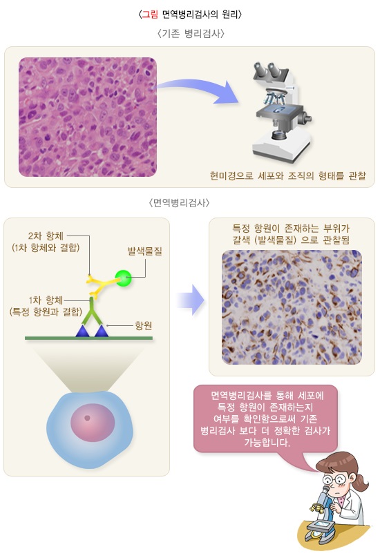 전통적인 병리 진단은 세포와 조직을 광학 현미경으로 관찰하여 그 형태학적 특성을 근거로 병을 진단하고 분류하였습니다. 그러나 현대인의 질병 범위가 넓어지고 분류가 복잡해짐에 따라 형태학적 소견을 통한 진단보다 정확한 병리 진단을 위해 면역 병리 검사가 시행되고 있습니다.
