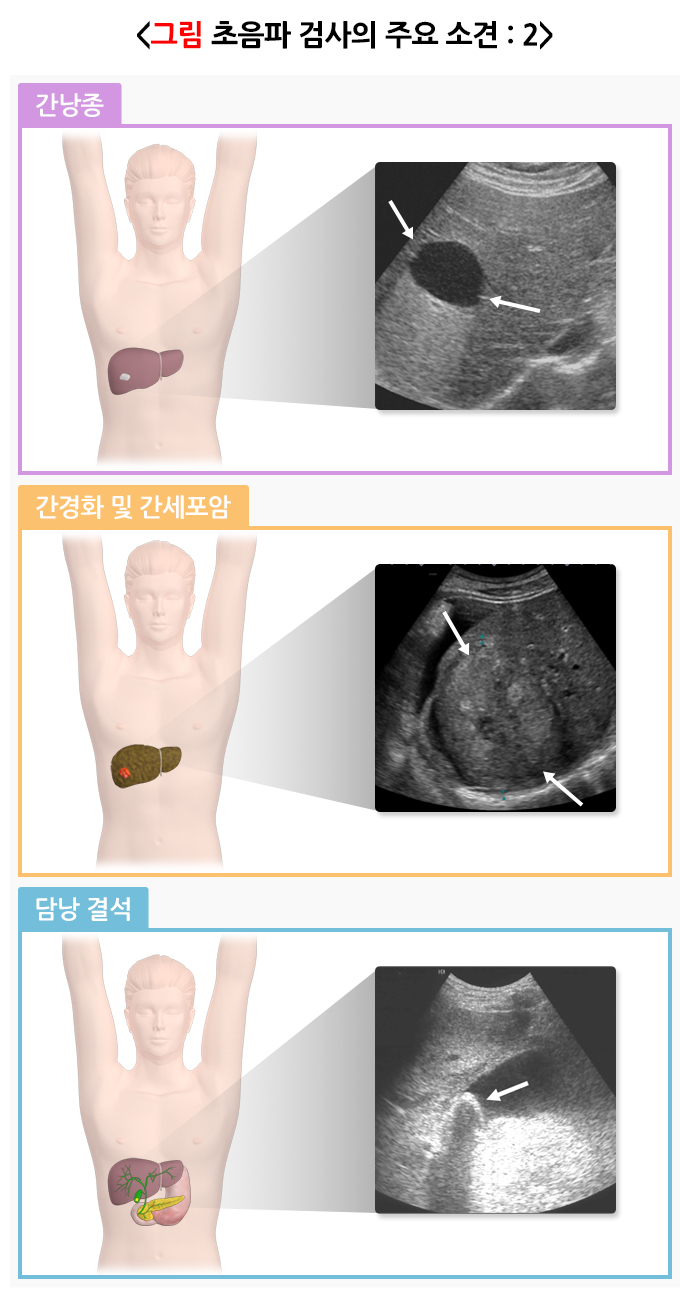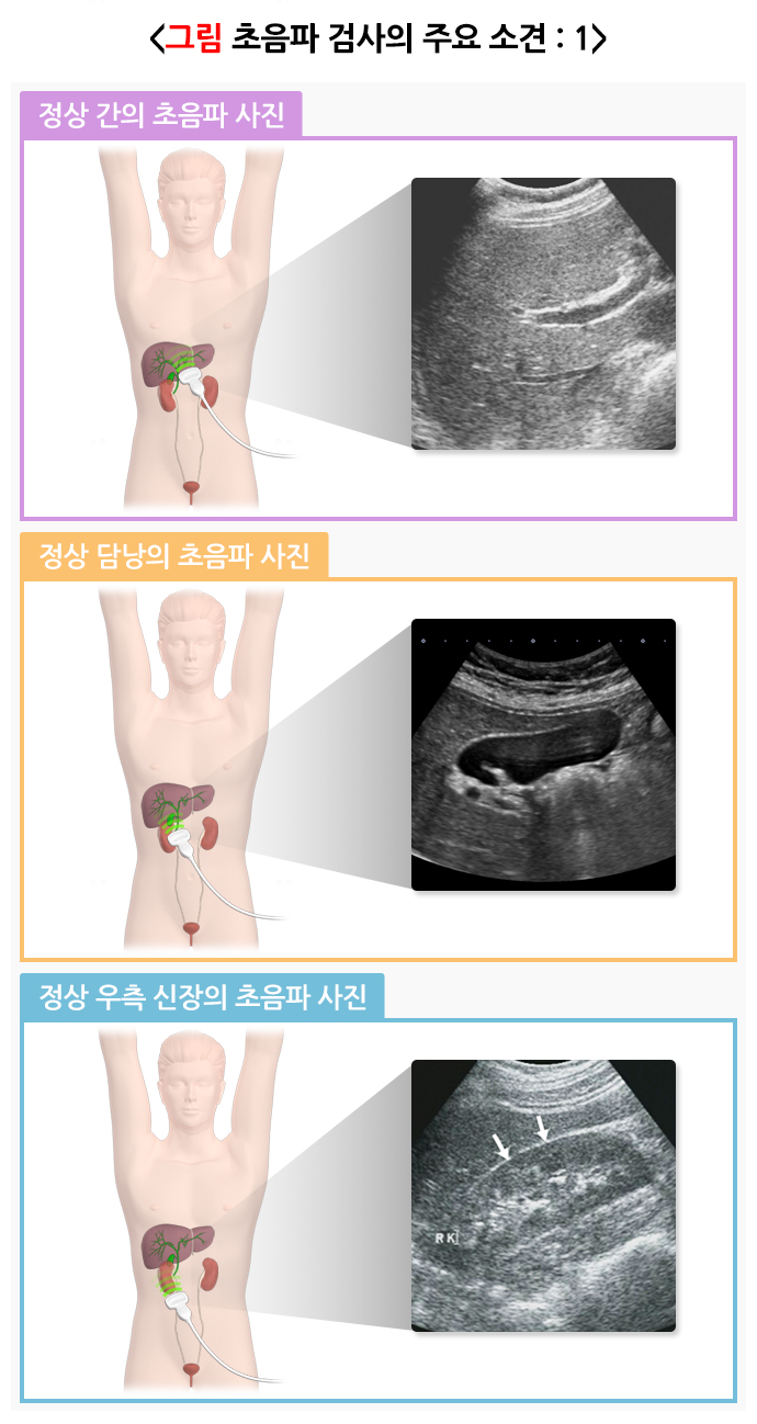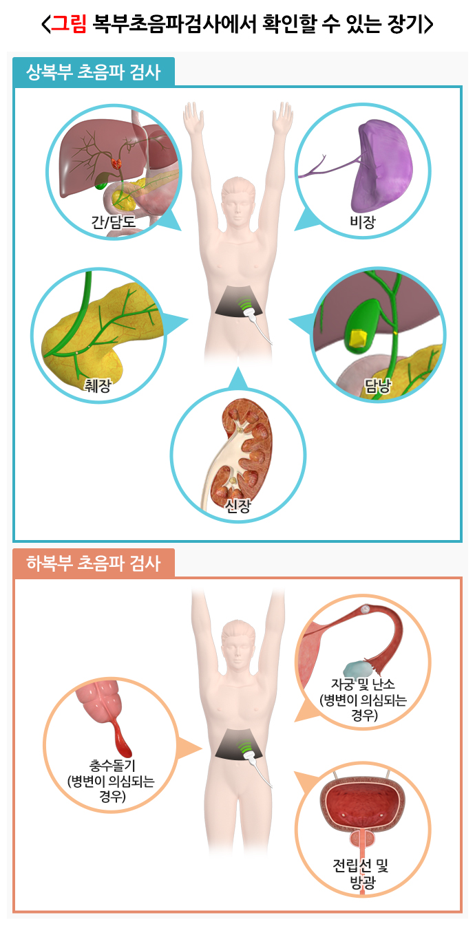 복부초음파검사, 간, 담낭, 담관, 신장, 췌장, 충수돌기염(맹장염), 자궁, 난소, 방광