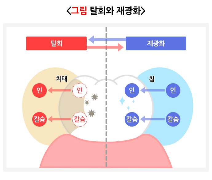 충치(치아우식)는 세균에 의해 발생하는 질환입니다. 치아에서의 세균 증식은 섭취한 탄수화물(fermentable carbohydrate)을 이용해 세균이 치아의 표면에 달라붙은 이후에 발생합니다. 이렇게 해서 생긴 세균 덩어리가 소위 말하는 치태(치면세균막, dental plaque 혹은 oral biofilm)입니다. 이 치태 속에 있는 세균은 음식물 속의 탄수화물을 분해하여 젖산(lactic acid) 등의 산을 만들어 냅니다. 이 산이 치아 표면을 녹이게 되어 충치(치아우식)가 생깁니다. 충치(치아우식)를 일으키는 세균이 생산하는 산은 치아의 바깥층인 법랑질을 녹이는데, 이러한 과정을 탈회(demineralization)라고 합니다. 이와 반대로 입안의 칼슘, 인, 불소 등이 탈회된 부위에 부착되어 회복시키게 되는 것을 재광화(재석회화, remineralization)라고 합니다.