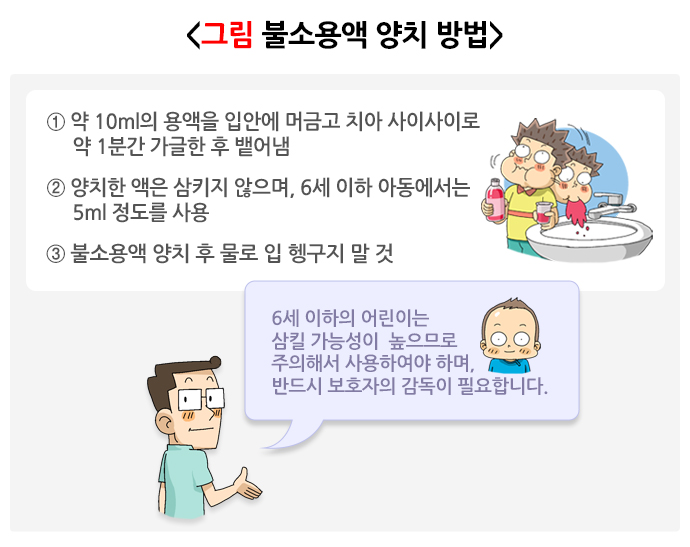 불소용액 양치 방법은, 약 10 ml의 용액을 입안에 머금고 치아에 골고루 닿을 수 있게 1분간 가글한 후 뱉어냅니다. 특히, 6세 이하 어린이는 삼킬 위험이 있으므로 5 ml 정도의 용액을 사용합니다.