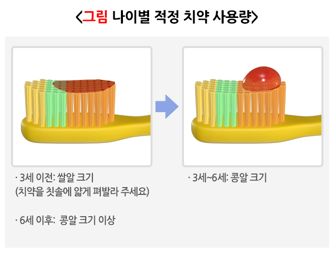 치약의 사용량은 나이에 따라 다릅니다. 3세 이전의 어린이는 쌀알 크기, 3~6세까지는 콩알 크기, 6세 이후에는 콩알 크기 이상의 치약을 사용하여야 합니다.