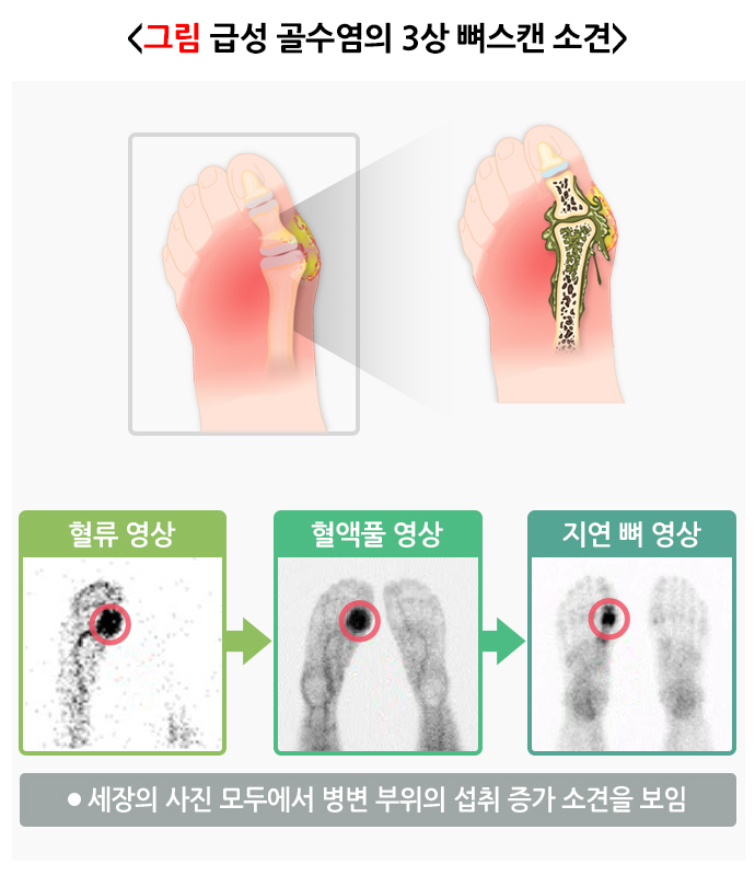 급성 골수염은 감염된 뼈 부위의 섭취 증가로 나타납니다. 감염 시에는 해당부위에 혈류가 많이 증가되기 때문에 이를 진단하기 위해 뼈스캔을 위한 정맥주사를 시행하면서 동시에 촬영을 하는 3상 뼈스캔을 시행합니다.