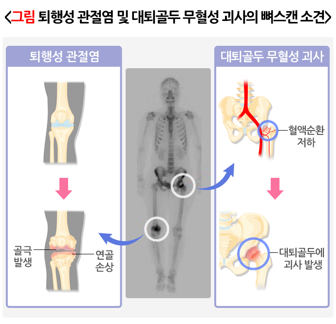 뼈스캔은 관절의 혈류 증가, 골 대사 증가 등 골관절염의 초기 생리적 변화를 보여주기 때문에, X-ray에서 이상소견이 나타나기 전에 먼저 이상소견을 보이는 경우가 많아 골관절염의 진단에 이용됩니다.