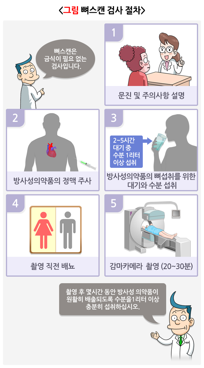 병원에서 시행되는 뼈스캔의 과정은 검사와 관련된 문진 및 주의사항 설명, 방사성의약품의 정맥주사, 촬영 전까지의 대기, 촬영 직전의 배뇨, 촬영으로 요약할 수 있습니다. 각 과정별 개요는 다음과 같습니다.