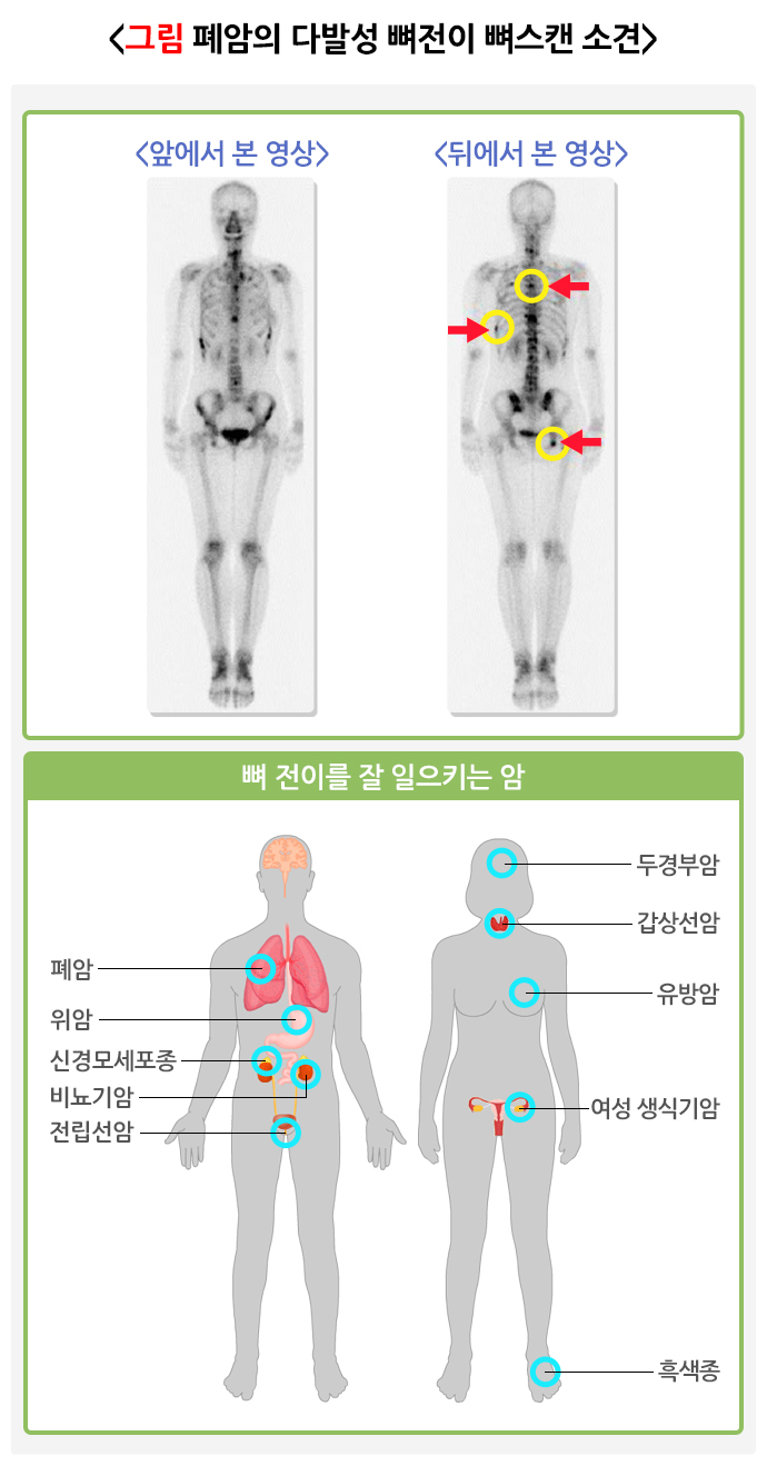 뼈는 암(악성종양)의 전이가 가장 많이 일어나는 장기 중 하나입니다. 뼈 전이가 흔한 암, 예를 들어 유방암, 전립선암, 폐암, 위장관암, 비뇨기계암, 신경계종양(신경모세포종), 여성생식기암, 흑색종, 갑상선암, 두경부암 등을 진단하기 위해 자주 이용됩니다.
